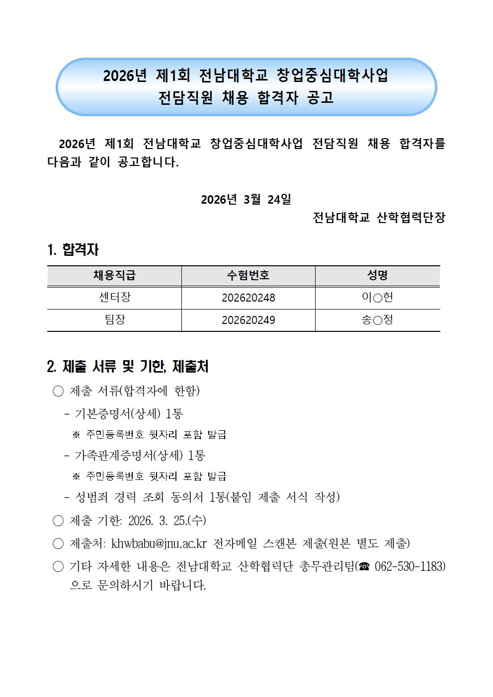 2026년 제1회 전남대학교 창업중심대학사업 전담직원 채용 합격자 공고